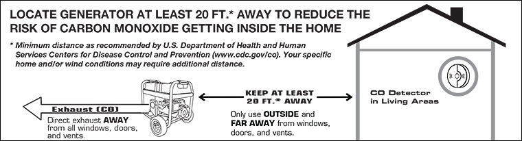 Even when you use a generator correctly, CO may leak into the home. ALWAYS use a battery-powered or battery-backup CO alarm in the home. If you start to feel sick, dizzy, or weak after the generator has been running, move to fresh air RIGHT AWAY. See a doctor. You could have carbon monoxide poisoning.